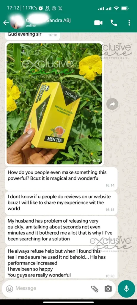 I continued with the tea, and things kept improving. The fear and anxiety that used to grip me before sex were gone. I was confident again, and our relationship grew stronger. We laughed more, talked more, and our intimacy returned.