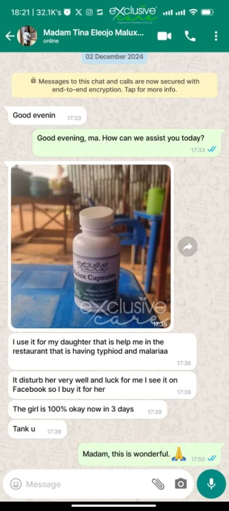 "This Malux capsule is really wonderful. My younger brother was so sick with typhoid that we almost rushed him to the hospital. We started him on Malux, and within days, he was back on his feet. Amazing!"