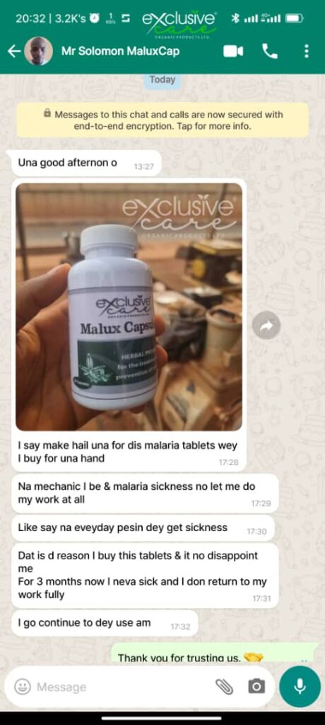 "I’m using Malux Capsule for prevention, and it has been wonderful. I'm not worried about malaria or typhoid even during rainy season."
