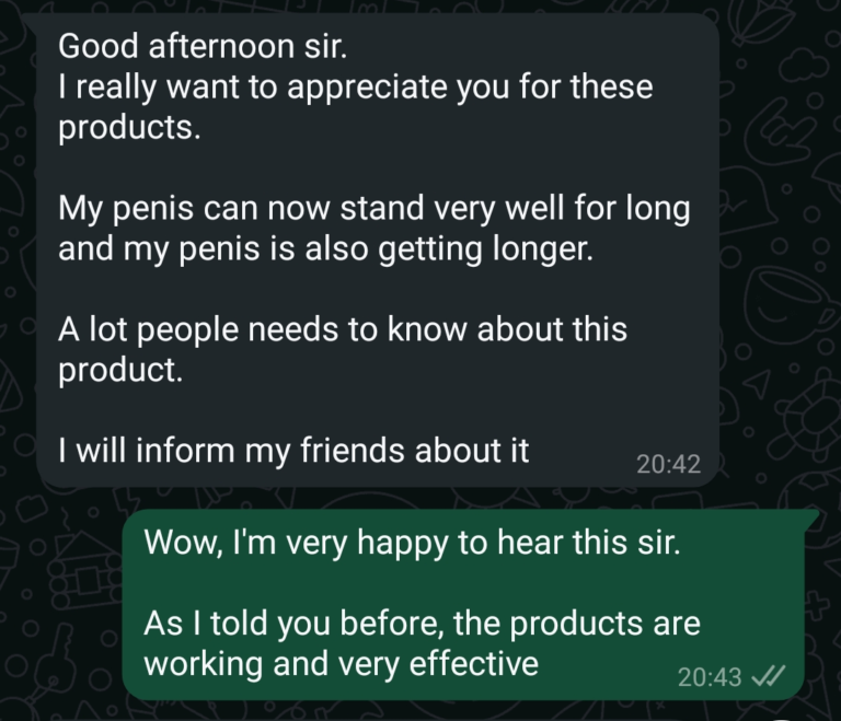 For the past 3 years, having sex with my wife has been difficult. Because my penis does not rise on time, i can not satisfy my wife in bed as she wants. It was when i got this product that i discovered that it was an infection that was causing it. After using the product together, i can now perform very well in bed. My penis is now longer.